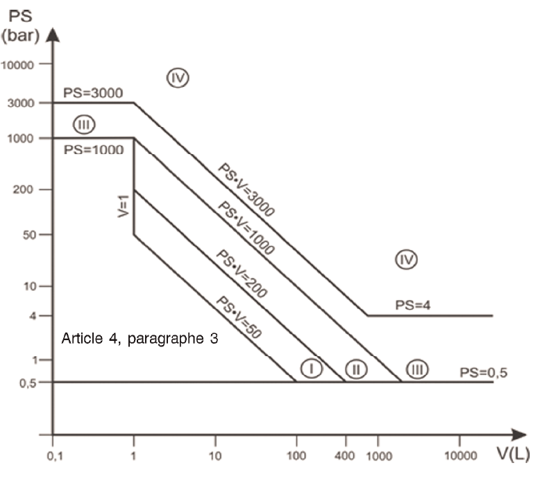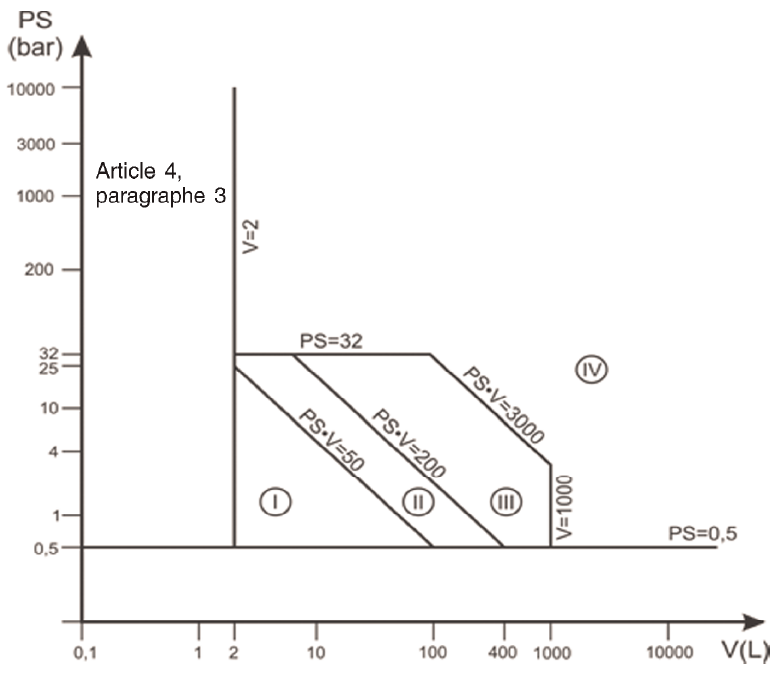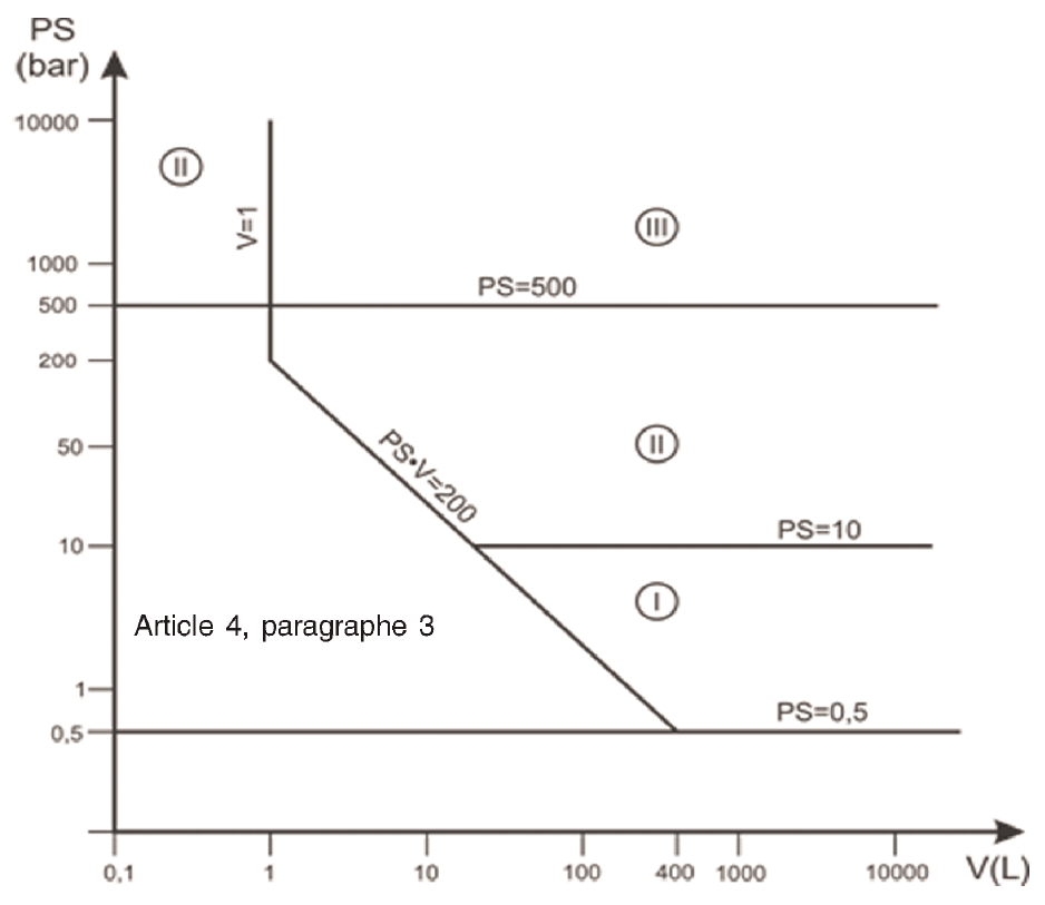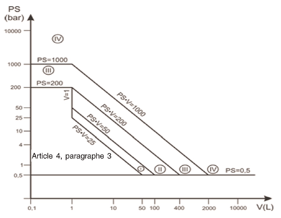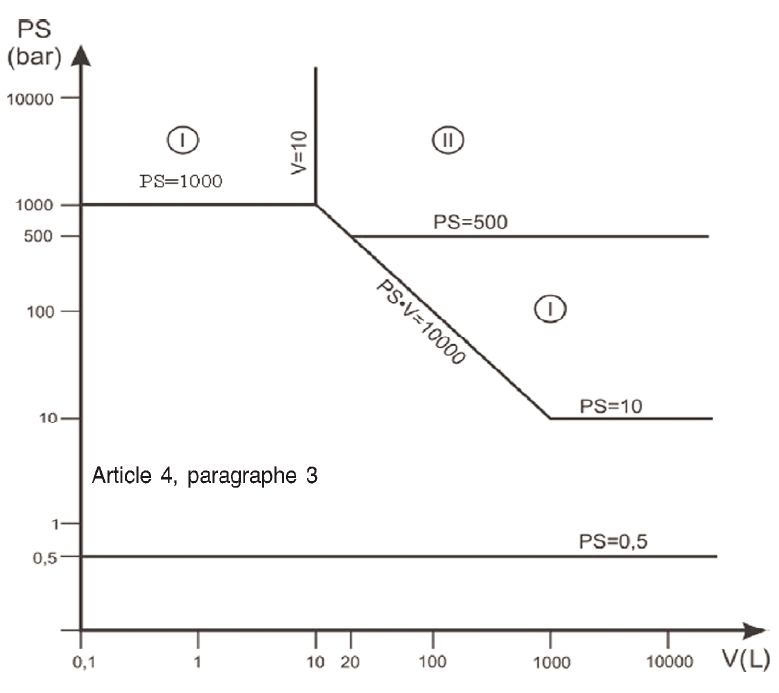 Récipients, à l’exception de ceux visés au point b), prévus pour des liquides dont la pression de vapeur, à la température maximale admissible, est inférieure ou égale à 0,5 bar au-dessus de la pression atmosphérique normale (1 013 mbar), pour les fluides du groupe 2, lorsque la pression PS est supérieure à 10 bar et le produit PS V est supérieur à 10 000 bar·L, ainsi que lorsque la pression PS est supérieure à 1 000 bar