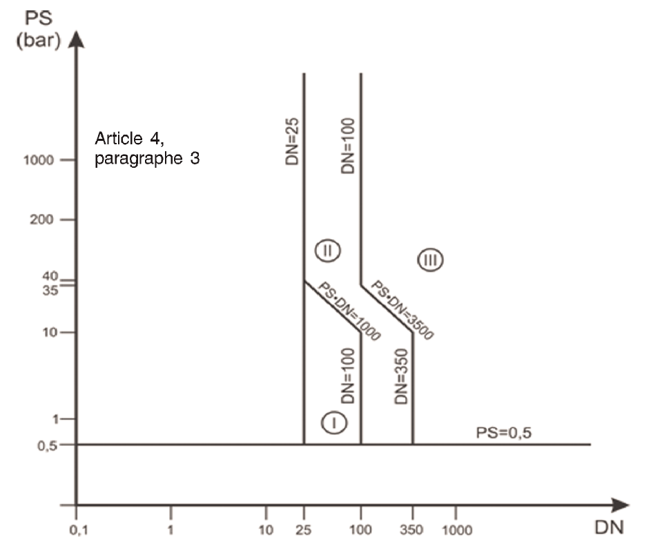 Tuyauteries prévues pour des liquides dont la pression de vapeur, à la température maximale admissible, est inférieure ou égale à 0,5 bar au-dessus de la pression atmosphérique normale (1 013 mbar) pour les fluides du groupe 1, lorsque la DN est supérieure à 25 et que le produit PS·DN est supérieur à 2 000 bar