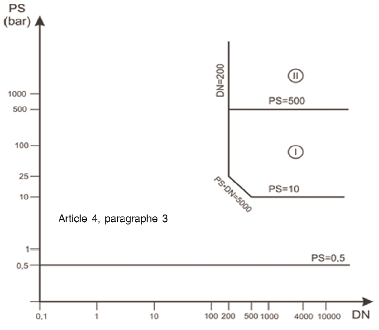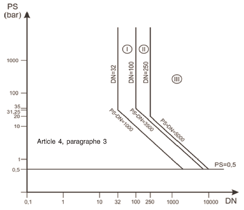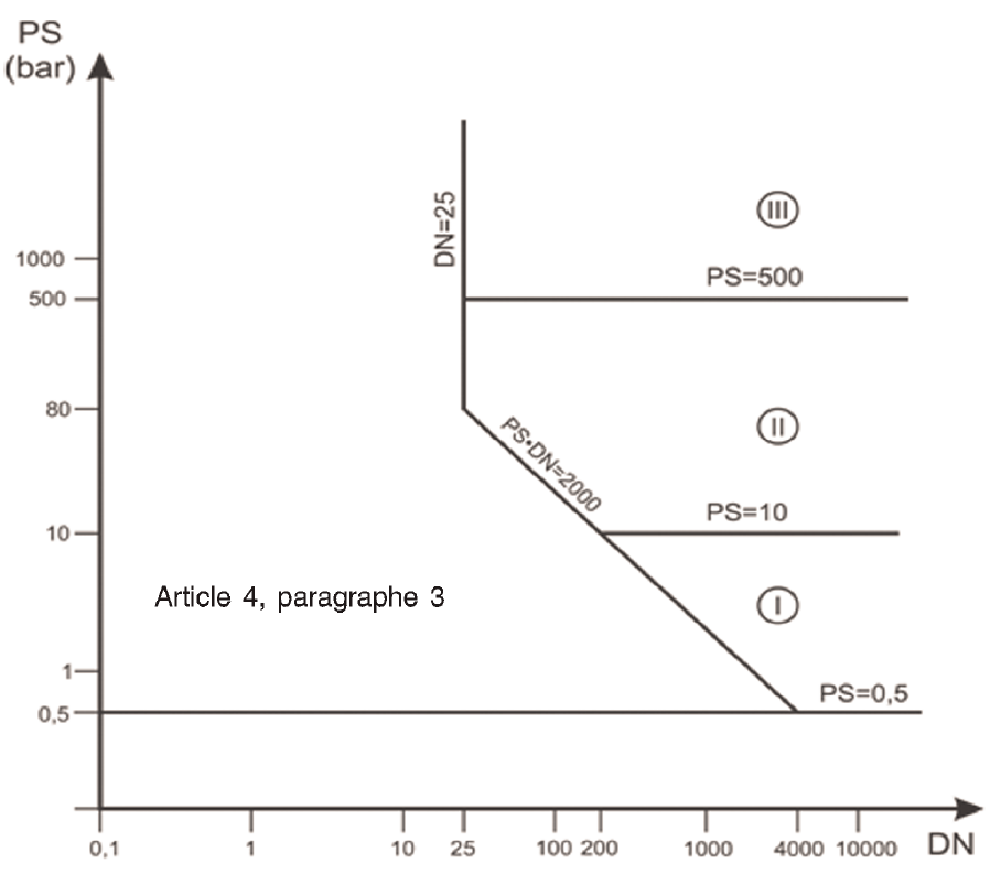 Tuyauteries prévues pour des liquides dont la pression de vapeur, à la température maximale admissible, est inférieure ou égale à 0,5 bar au-dessus de la pression atmosphérique normale (1 013 mbar) pour les fluides du groupe 2, lorsque le PS est supérieur à 10 bar et la DN est supérieure à 200 et le produit PS·DN est supérieur à 5 000 bar